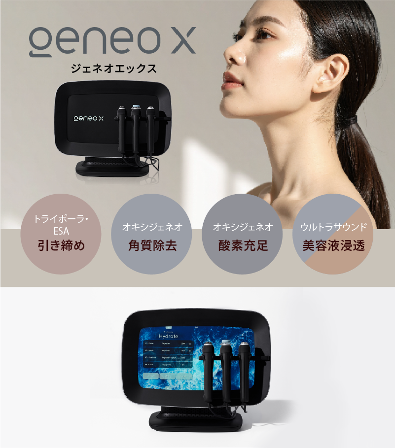 ジェネオエックス(GENEO X)は、最新の美容医療機器で、肌質改善やリフトアップ、美白効果などを同時に実現できる多機能トリートメントです。独自のテクノロジーを組み合わせることで、肌の表面から深部にまでアプローチし、エイジングケアや美肌づくりをサポートします。従来の施術と比べてダウンタイムが少なく、幅広い肌質や年齢層に対応できるのが特徴です。