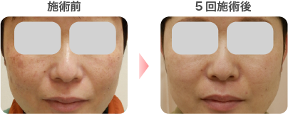 A 1回の施術でも肌のシミやくすみが薄くなったり、ハリやキメなどにも効果を実感できますが、1ヶ月に1回程度の間隔で5回以上は続けて施術していただけると効果に満足できるでしょう。肌のお悩みによって必要となる施術回数が異なりますので、詳しくはカウンセリングでご相談ください。